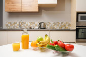 Jasne zdjęcie kuchni w kolorze białym z piekarnikiem elektrycznym, lodówką i drewnianymi białymi szafkami stołowymi i innym sprzętem w domu z pustym stołem. tło wewnętrzne