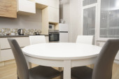 Stół z wazonem kwiatowym w pobliżu kuchni z lodówką, podłoga jest wyłożona kafelkami z wzorami, elektryczne, kuchenka mają dołączone do ściany, doniczka i płyta ceramiczna na stole jadalnym, krzesło w kolorze białym
