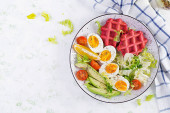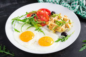 Breakfast with pumpkin waffles, fried egg, tomato, avocado and arugula on white background. Appetizers, snack, brunch. Healthy vegetarian food.