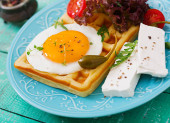 Breakfast with pumpkin waffles, fried egg, ham, tomato, avocado, beans and olives on white background. Appetizers, snack, brunch. Healthy food.