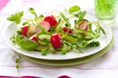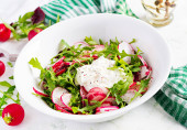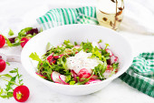 Vegetarian vegetable salad of radish and arugula with sour cream. Healthy vegan food.