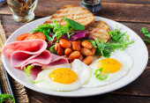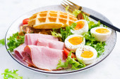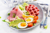 Zdjęcie "Breakfast with pumpkin waffles, fried egg, ham, tomato, avocado, beans and olives on white background. Appetizers, snack, brunch. Healthy food." może być wykorzystywane do celów osobistych i komercyjnych zgodnie z warunkami zakupionej licencji Royalty-free. Obraz jest dostępny do pobrania w jakości wysokiej rozdzielczości do 5760x3840.