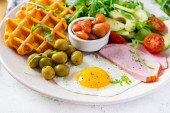 Breakfast with pumpkin waffles, fried egg, ham, tomato, avocado, beans and olives on white background. Appetizers, snack, brunch. Healthy food.