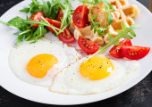 Breakfast with pumpkin waffles, fried egg, ham, tomato, avocado, beans and olives on white background. Appetizers, snack, brunch. Healthy food.
