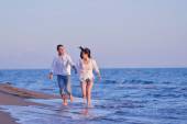 szczęśliwa rodzina bawi się z psem na plaży