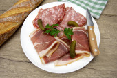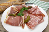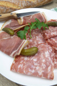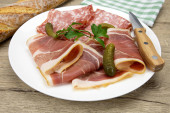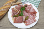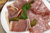 Płyta z wędliny składająca się z suchej szynki i pieprzu.