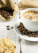 filiżanka kawy z brązowego cukru i francuski rogalik czekoladowy