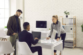 Szczęśliwy młody, zróżnicowany zespół handlowy świętuje swoją pracę zespołową i sukces komercyjny
