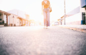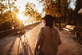 Młoda kobieta podróżująca w żółtej kurtce i kapeluszu spacerująca w słonecznym dniu w europejskim mieście