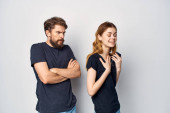 mężczyzna i kobieta w białych słuchawkach stoją obok siebie na szarym tle w tych samych koszulkach