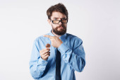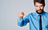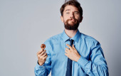 Biznes człowiek w koszuli z krawatem Bitcoin kryptowaluta emocje sukces