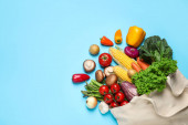 Świeże organiczne owoce i warzywa na jasnoniebieskim tle, płaskie leżaki. Miejsce na tekst