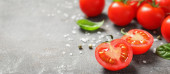 Świeże pomidory wiśniowe i liście bazylii na szarym stole, zbliżenie
