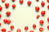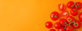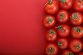 Świeże pomidory wiśniowe i liście bazylii na czerwonym tle, płaskie układanie. Miejsce na tekst