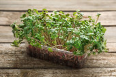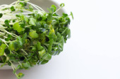 Świeże organiczne mikrozielone na białym stole, zbliżenie