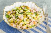 Pyszna sałatka rosyjska Olivier podawana na jasnoszarym stole