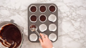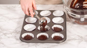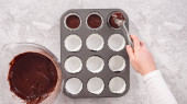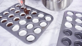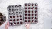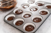 Krok po kroku. Scooping ciasto babeczkowe do linii mini babeczki do pieczenia mini babeczki czekoladowe.