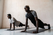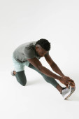 Młody afrykański sportowiec robi ćwiczenia podczas treningu na białym tle
