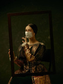 Młoda Japonka jako gejsza na ciemnozielonym tle. Styl retro, porównanie koncepcji ery.