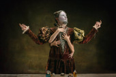 Zdjęcie "Młoda Japonka jako gejsza na ciemnozielonym tle. Styl retro, porównanie koncepcji ery." może być wykorzystywane do celów osobistych i komercyjnych zgodnie z warunkami zakupionej licencji Royalty-free. Obraz jest dostępny do pobrania w jakości wysokiej rozdzielczości do 5760x3840.