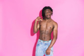 Zadowolony afrykański sportowiec używający słuchawek podczas treningu na szarym tle