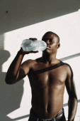 Afrykański sportowiec bez koszuli, używający słuchawek podczas picia wody odizolowanej na szarym tle
