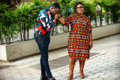 urocza rodzina stojąca na ulicy rozmawiająca i uśmiechnięta.