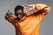 Afrykański sportowiec bez koszuli, korzystający ze słuchawek podczas rozciągania rąk na szarym tle
