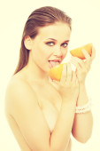 Zdjęcie "Naga kobieta posiada żółte świeżego melona." może być wykorzystywane do celów osobistych i komercyjnych zgodnie z warunkami zakupionej licencji Royalty-free. Obraz jest dostępny do pobrania w jakości wysokiej rozdzielczości do 5760x3840.