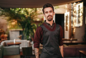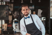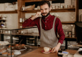 Pewny siebie wytatuowany barista w przytulnej kawiarni