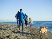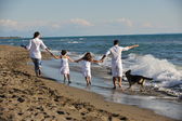 szczęśliwa rodzina bawi się z psem na plaży