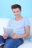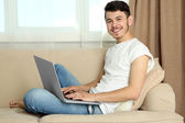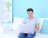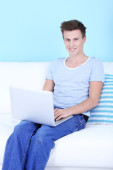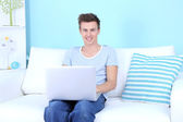 facet siedzi na kanapie z laptopem na niebieskim tle