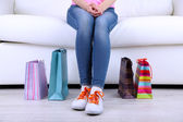 kobieta siedzieć na kanapie z torby na zakupy z bliska
