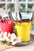 sztućce kuchnia w metalu stanąć na drewnianym stole na jasnym tle
