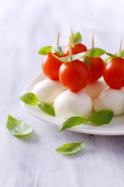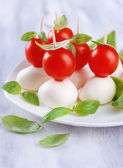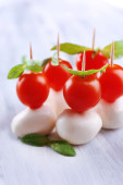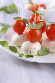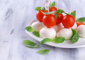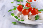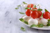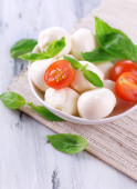 ser smaczny mozzarella z bazylią i pomidory na talerzu, na drewnianym stole