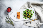 Fińska zupa rybna z łososiem i ziemniakami. Szare tło, widok z góry, miejsce na tekst.