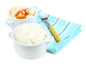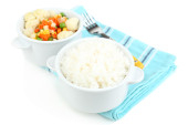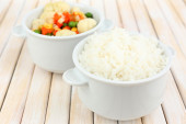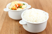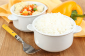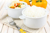 ugotowany ryż z warzywami na drewnianym stole z bliska