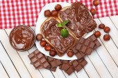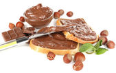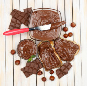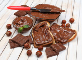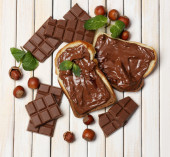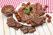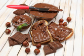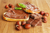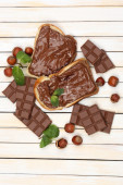 chleb z słodka czekolada z orzechami laskowymi rozprzestrzenił się na drewniane tła