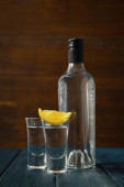 butelkę wódki i cytrynowy plasterek na czarnym tle