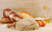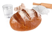 butelka wódki, świeże pieczywo i szkło na desce, na czarnym tle