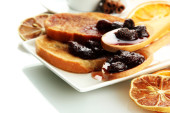 Kompozycja z kieliszków wódki i marynowane warzywa, świeże pieczywo na desce, na czarnym tle