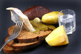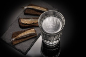 Kompozycja z kieliszków wódki i marynowane warzywa, świeże pieczywo na desce, na czarnym tle
