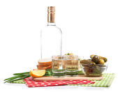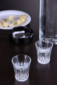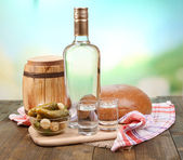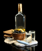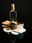 butelka wódki, kanapka z solonych ryb i okulary na desce, na czarnym tle