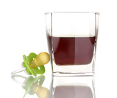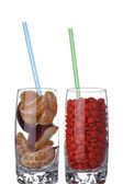 Kompozycja z dwóch kieliszków wódki i marynowane warzywa, na białym tle