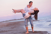 szczęśliwa rodzina bawi się z psem na plaży
