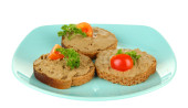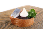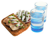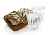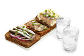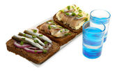 Kompozycja z dwóch kieliszków wódki, a kanapki dowcip ryby solone, na białym tle