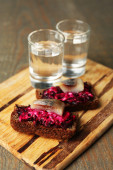 Kompozycja z dwóch kieliszków wódki, a kanapki dowcip ryby solone, na białym tle