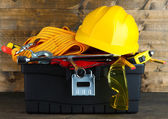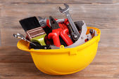 Maszyny budowlane na drewnianym stole, na jasnym tle