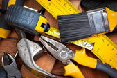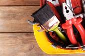 Maszyny budowlane na drewnianym stole, na jasnym tle