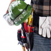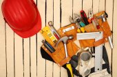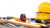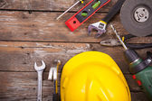 Maszyny budowlane na drewnianym stole na tle ściany